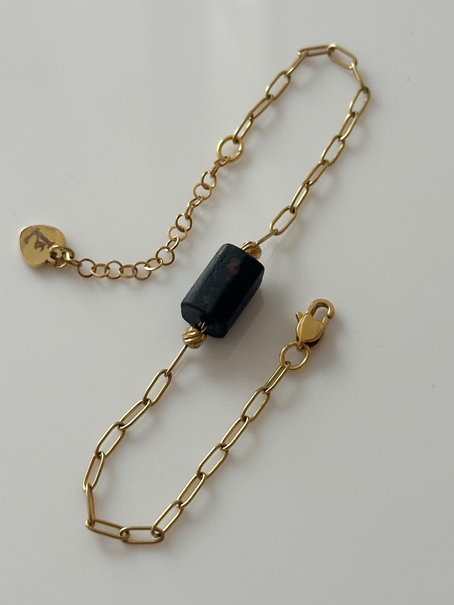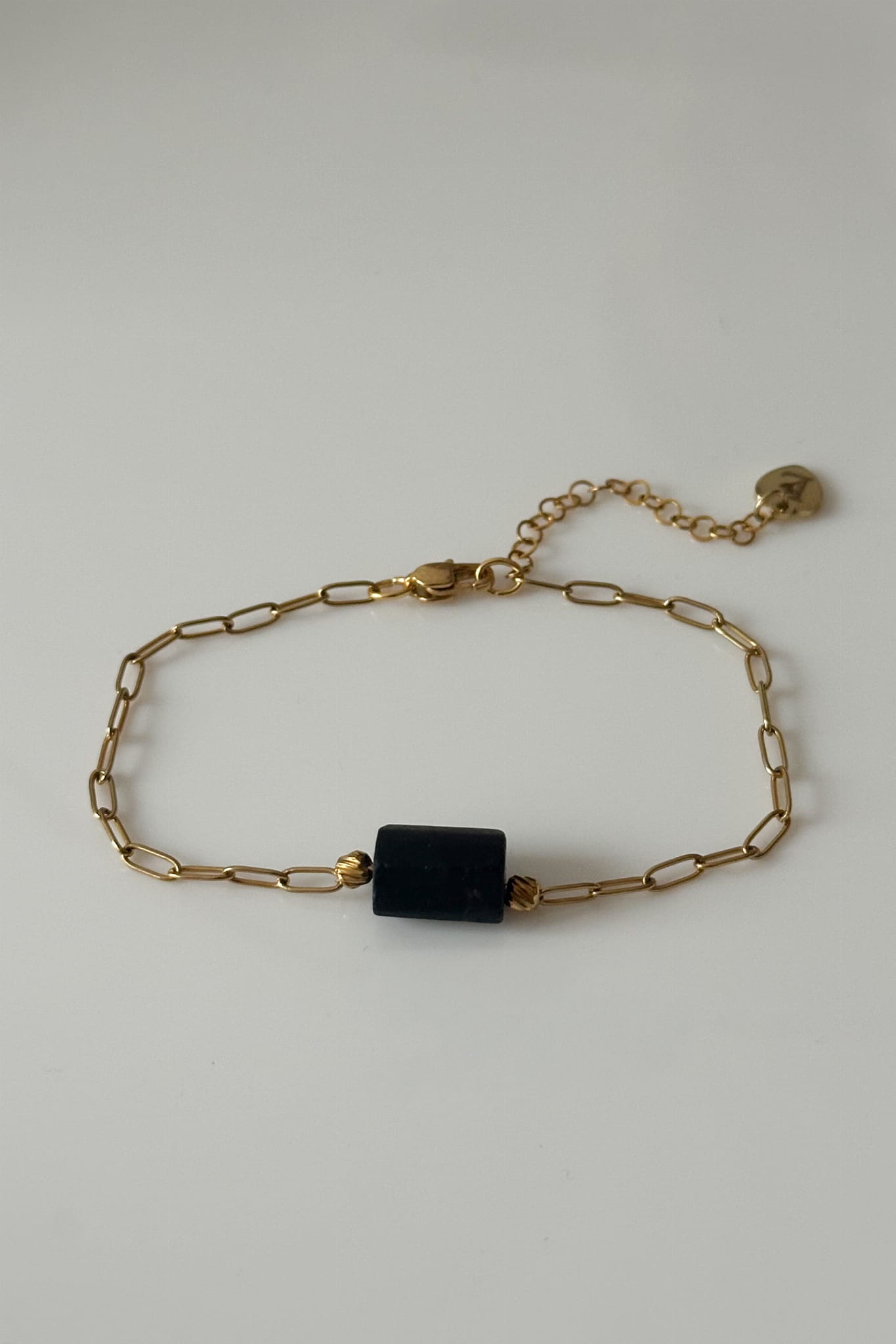 Subtelna, złota bransoletka z czarnym turmalinem — symbolem ochrony i wewnętrznej siły.