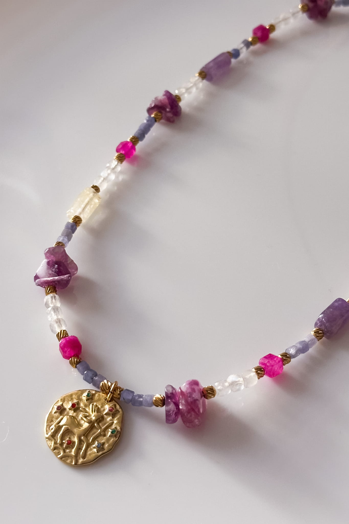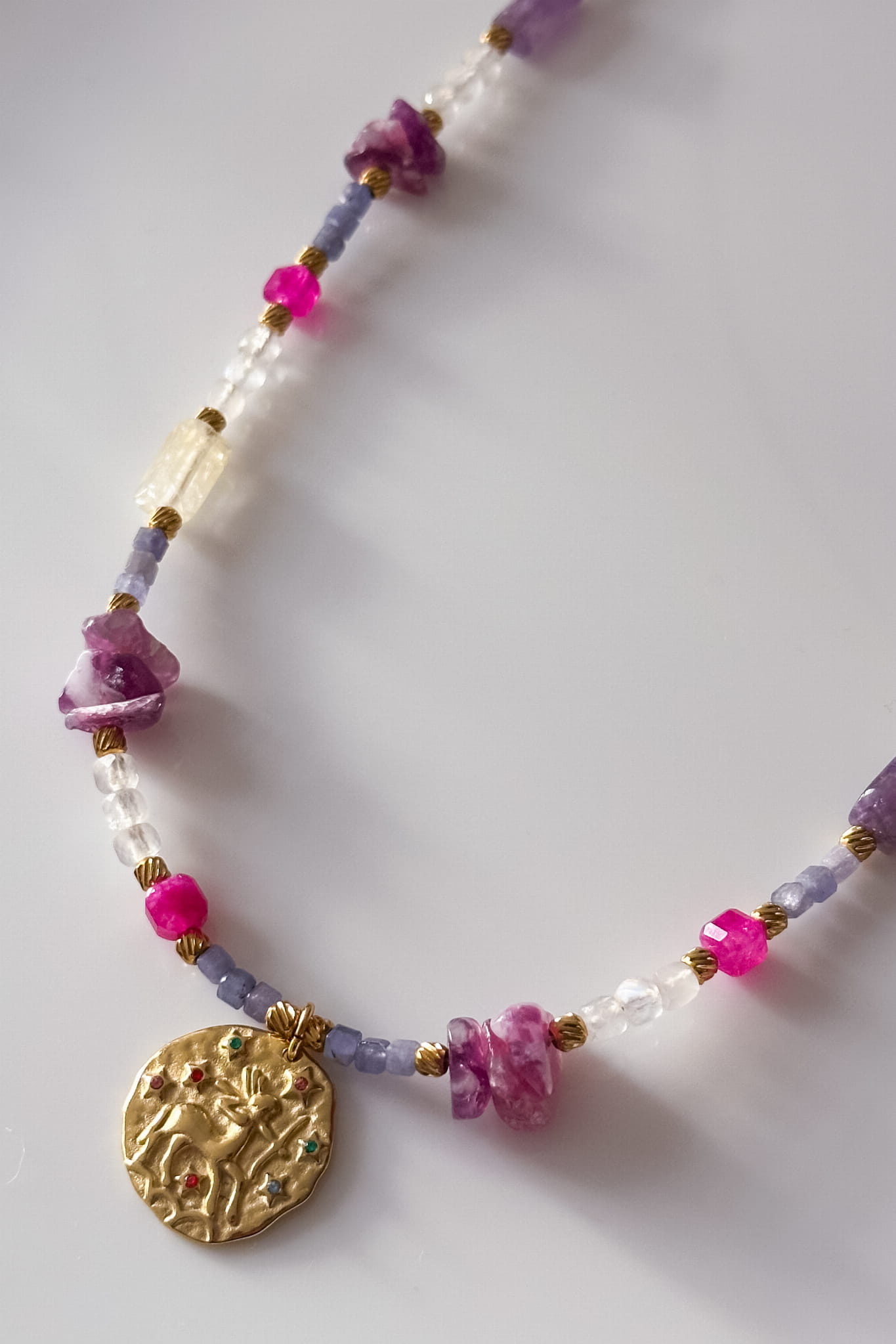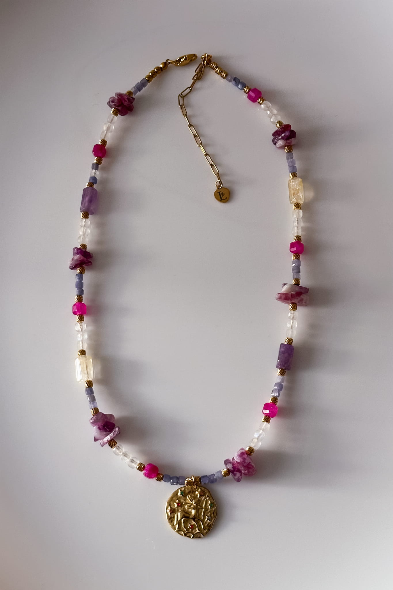 Naszyjnik Strzelec to talizman stworzony z tanzanitu, kamienia księżycowego, lepidolitu, cytrynu i ametystu, zaprojektowany specjalnie dla kobiet spod znaku Strzelca. Połączenie barw i struktur kamieni podkreśla intuicję, spokój i odwagę do podejmowania nowych kroków. Ręcznie wykonany naszyjnik ze stali szlachetnej z astrologiczną monetą tworzy wyjątkową biżuterię o głębokiej symbolice.