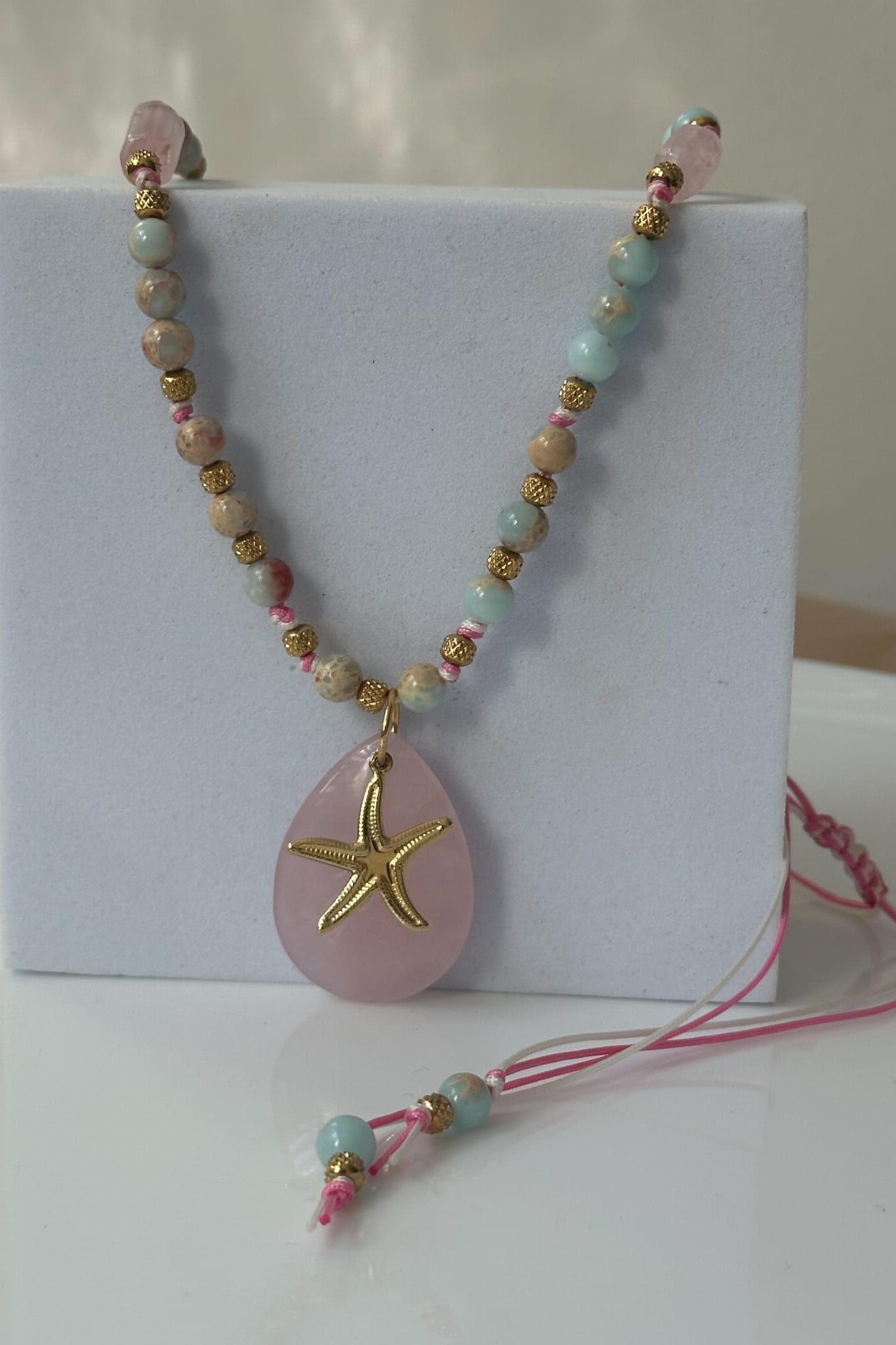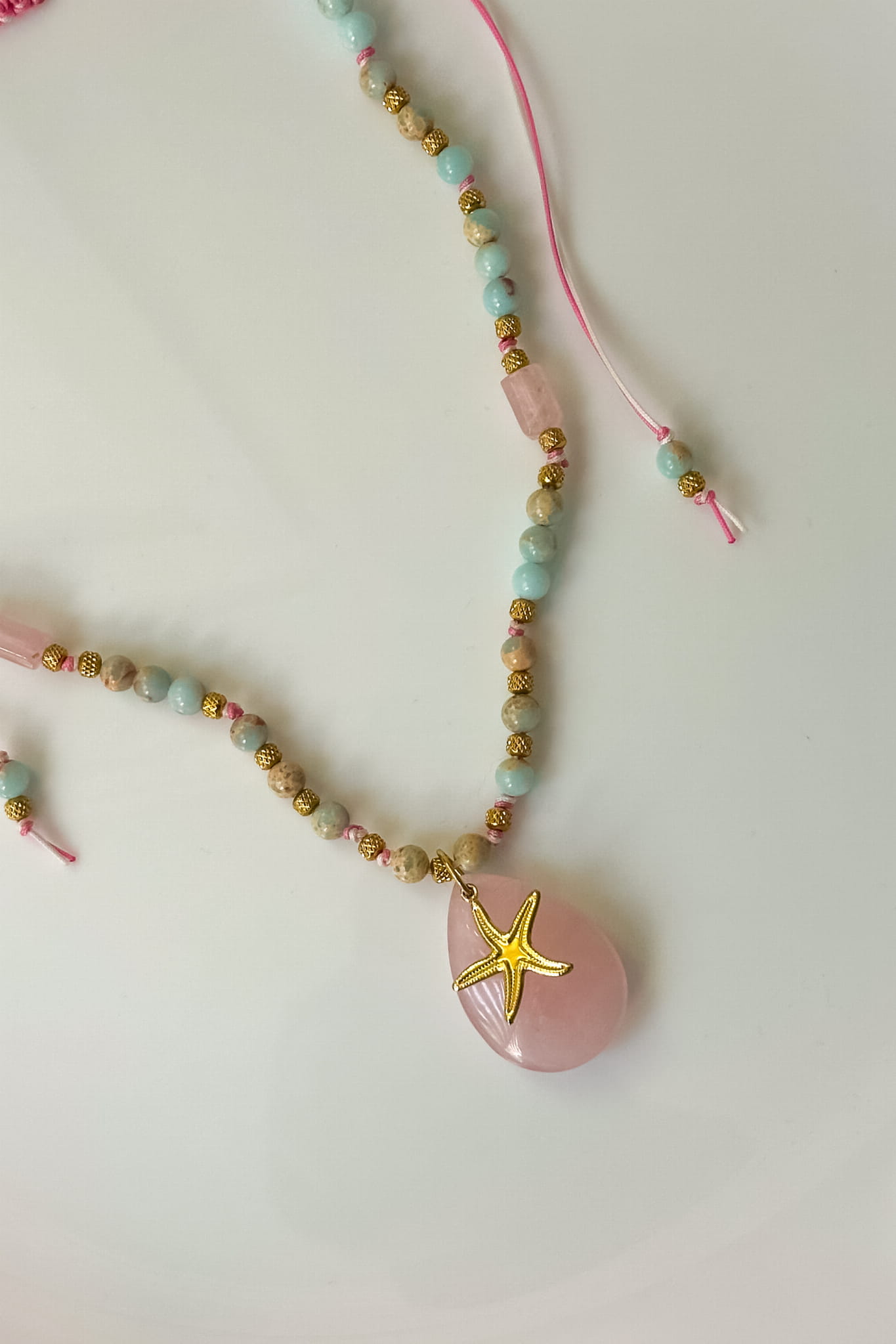 Ten naszyjnik to jak letni sen o miłości – delikatny, pastelowy, ale z błyskiem odwagi. W centrum duża łza z kwarcu różowego – symbol czułości, uzdrowienia i tego, co najważniejsze. Złota rozgwiazda to przewodnik – przypomina, że nawet na dnie oceanu można odnaleźć swoje światło.